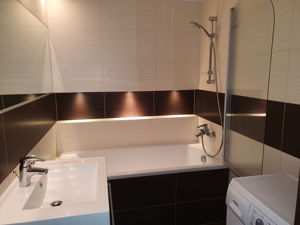 6. łazienki, wyposażoną w wannę z parawanem, prysznic, pralkę, podgrzewane lustro, oświetlenie nastrojowe oraz WC z systemem oświetlenia LED, deską wolno opadającą;